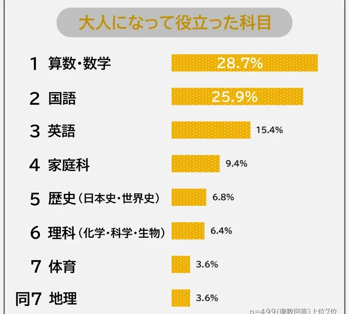 大人になって役立った学校の科目、TOP3は「算数・数学」「国語」「英語」=R&G調べ=R&Gは7日、20代以上の男女499人を対象に実施した···